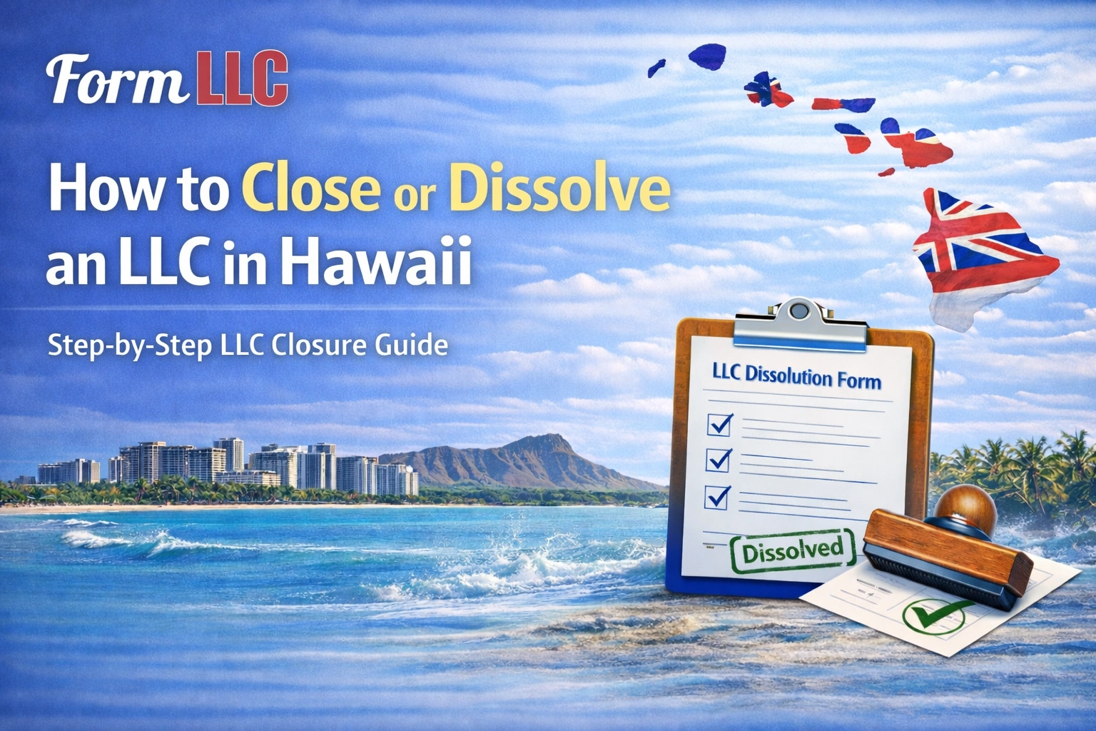 By following the correct process, bringing annual registrations and tax matters current, filing a Certificate of Cancellation, and completing any remaining wind-down steps, LLC owners can close their businesses with confidence. If you prefer guided support, FormLLC can help ensure your Hawaii LLC is closed correctly and without unnecessary delays, penalties, or future compliance issues.